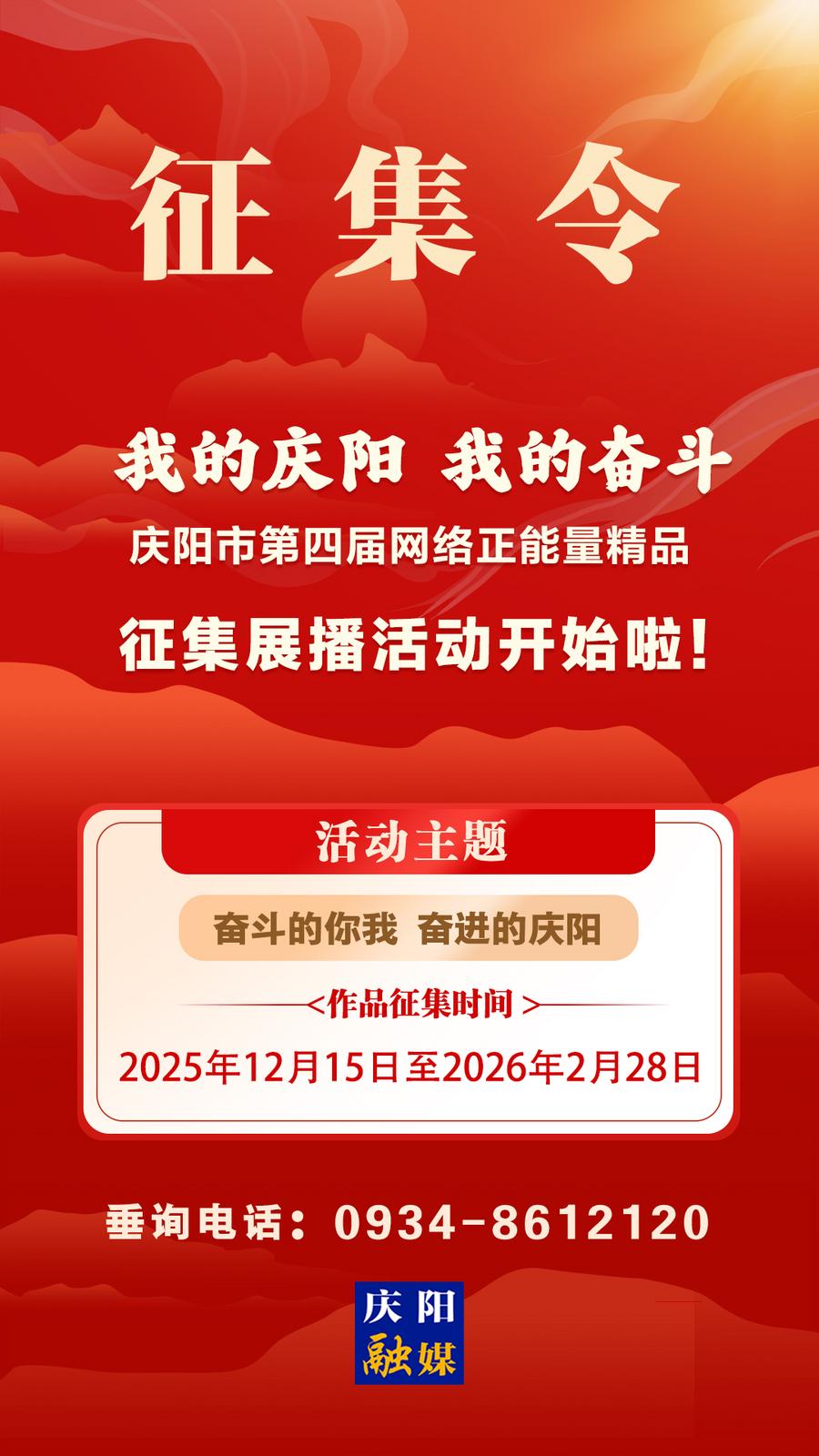 为深入学习贯彻习近平新时代中国特色社会主义思想特别是习近平文化思想、习近平总书记关于网络强国的重要思想,全面贯彻落实党的二十届四中全会精神及习近平总书记在中共中央政治局第二十三次集体学习时的重要讲话精神,着眼丰富网络优质内容供给,更好发挥主流媒体的示范引领作用,聚焦我市以“双轮”驱动、“三化”并进、“四建”支撑思路推动高质量发展的生动实践,推出更多有内涵、有温度、有影响的网络正能量精品,以正面声音、主流价值、时代新风塑造网络空间,市委网信办决定组织开展“我的庆阳 我的奋斗”庆阳市第四届网络正能量精品征集展播活动。